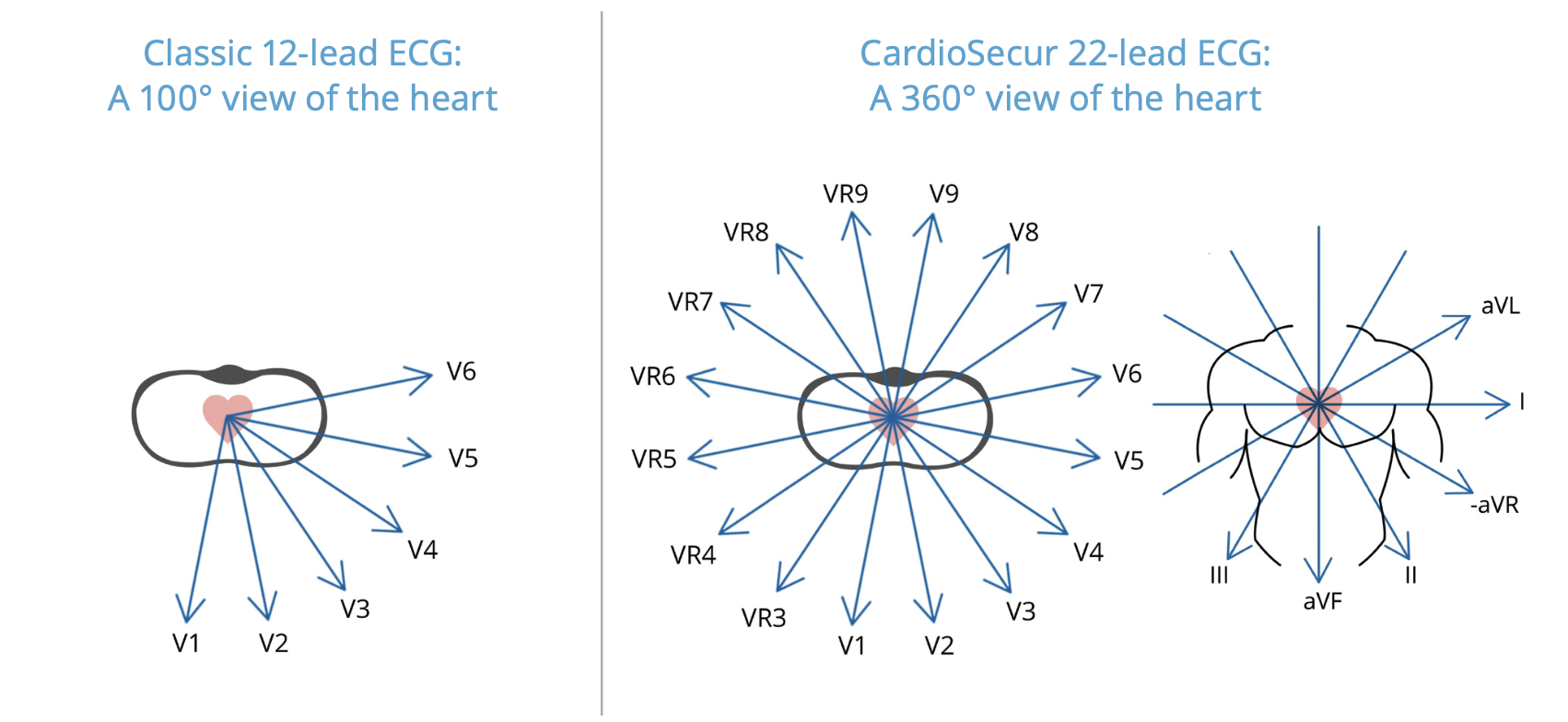 ✔️ 360° ECG through 22 lead recording (I, II, III, aVR, aVL, aVF, V1-V6 plus V7-V9 and VR3-VR9)