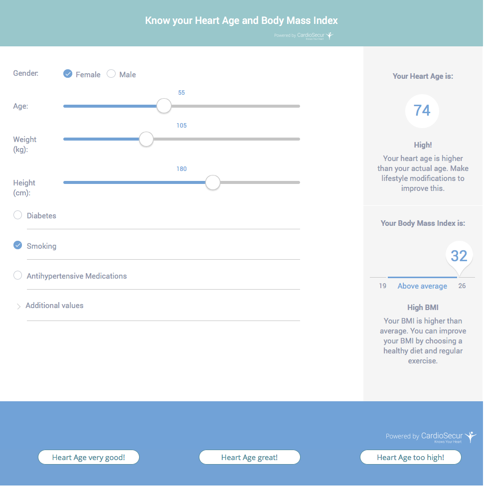 CardioSecur has developed a HeartAge Calculator. This calculates if your heart age is younger than, older than, or corresponds to your actual age.