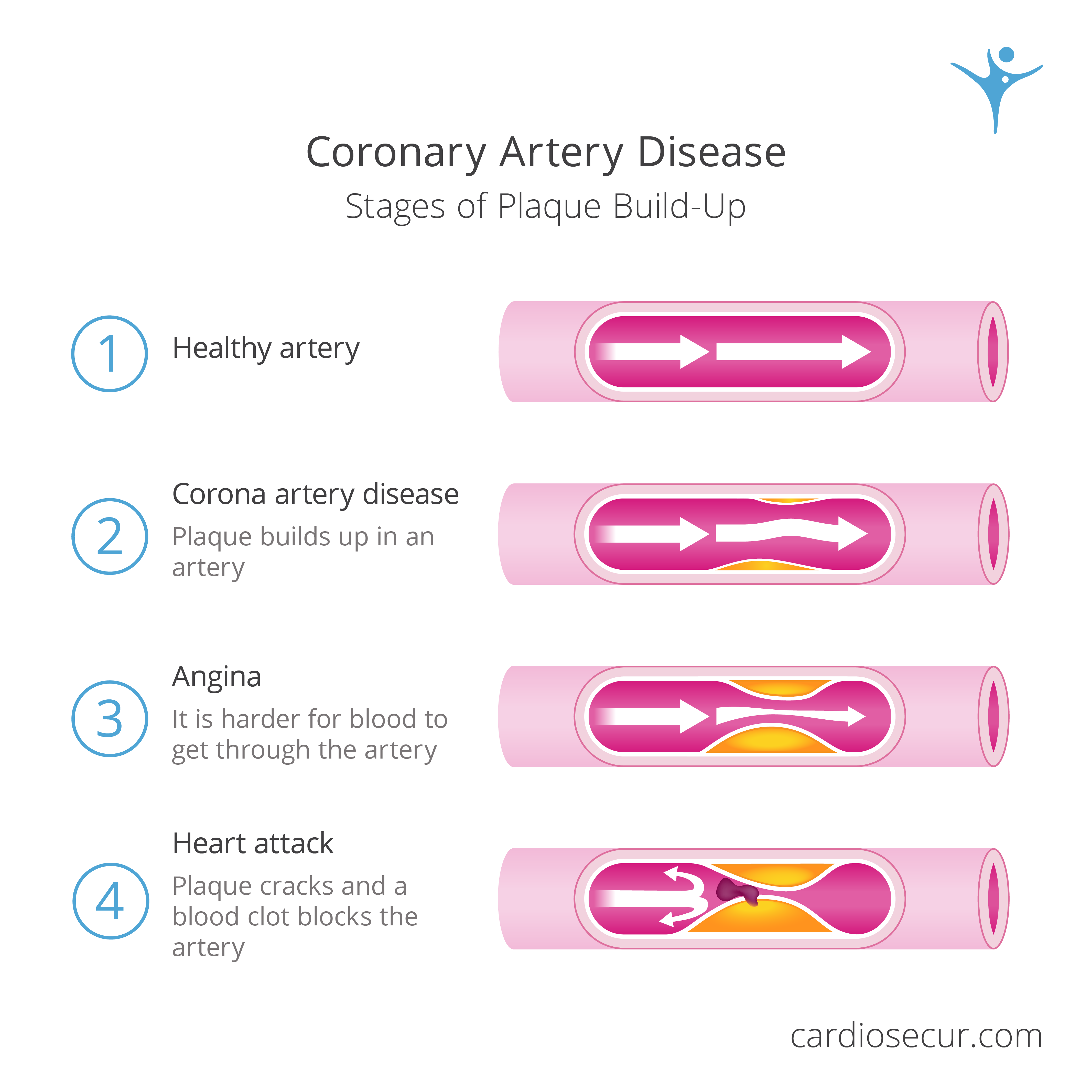 High blood pressure (hypertension), diabetes mellitus and smoking damage the inner walls of the blood vessels. These damaged vessel walls can store more fats, which in turn promotes the formation of plaques and leads to coronary heart disease.